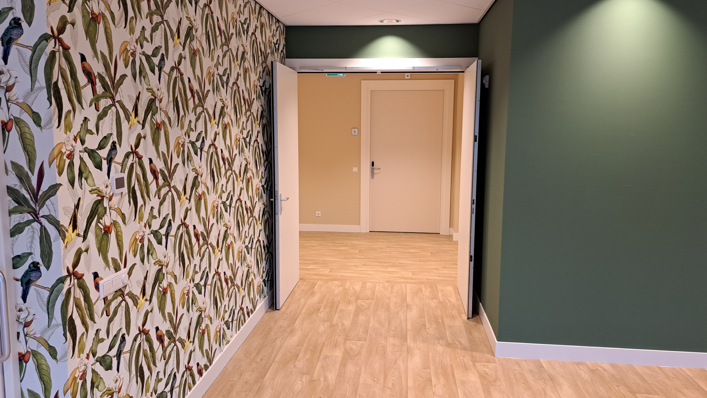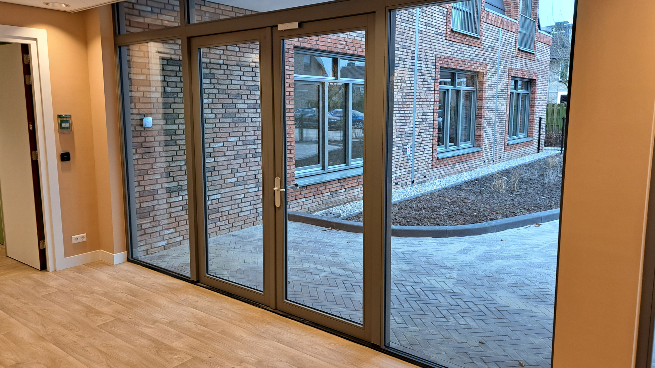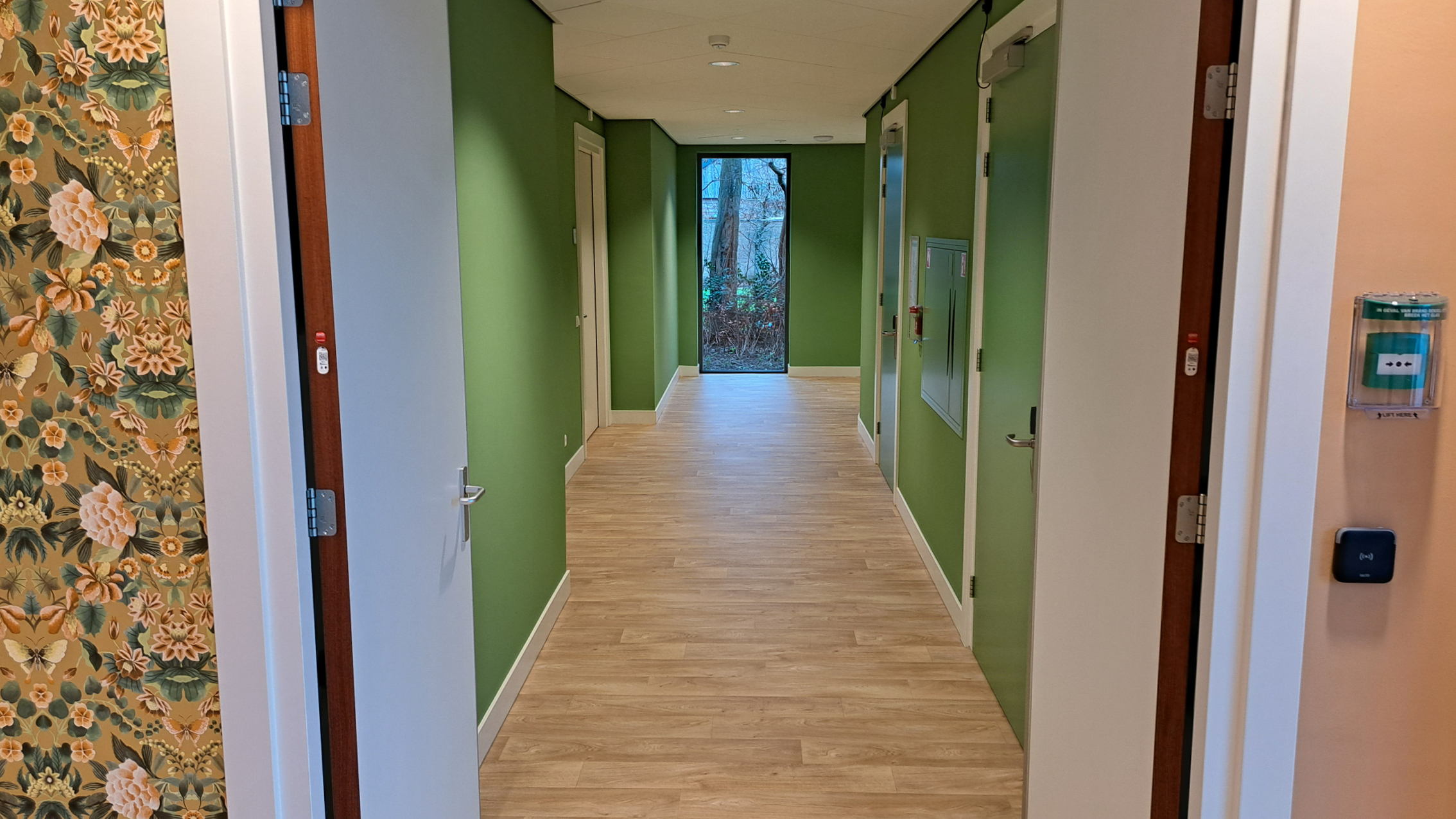 Bij het verlaten van de studio komt men in een beschermde, gemeenschappelijke leefomgeving waar het dagelijks leven zich afspeelt. Het gebouw biedt diverse voorzieningen zoals een gezellige woonkeuken, zitruimtes en plekken voor activiteiten. Vanuit de gezamenlijke ruimtes is er toegang tot een beschutte tuin, waar bewoners kunnen wandelen, genieten van de buitenlucht of rustig zitten.